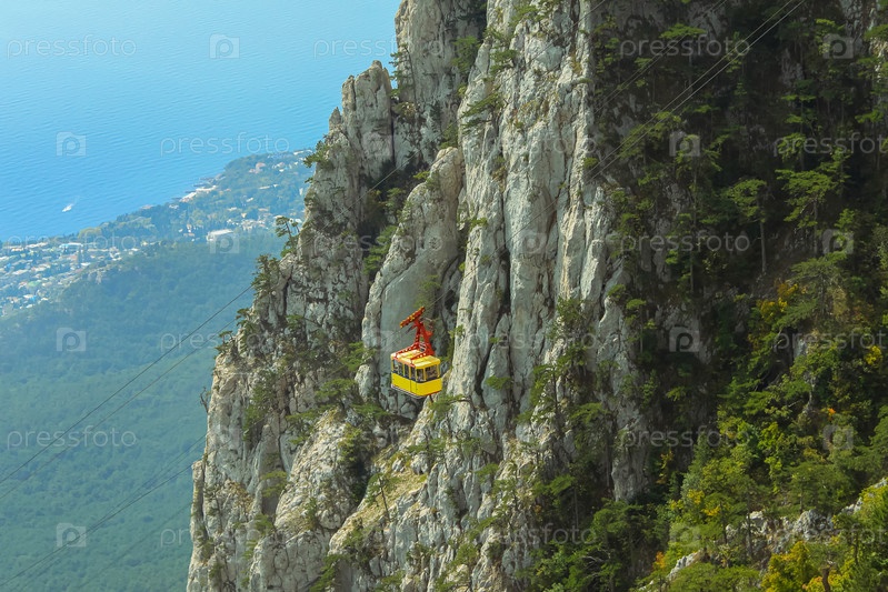 Желтая кабина фуникулера на фоне крутого обрыва Ай-Петри в Крыму. Вид на горы, лес и море сверху. Канатная дорога Мисхор-Сосновый Бор-Ай-Петри