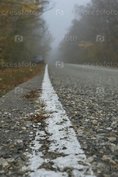Треснувшая белая сплошная линия на обочине асфальтовой дороги уходит в перспективу. Проселочная дорога в осеннем туманном лесу. Вдали на обочине стоит машина. Таинственный пейзаж