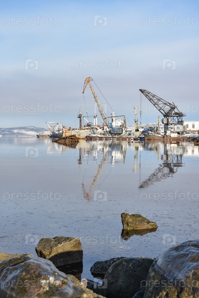 Вид на доки зимой с моря. камни на переднем плане