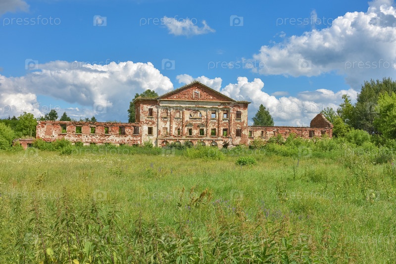 Заброшенная усадьба из красного кирпича в окружении зелени на фоне неба