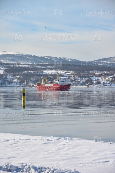 Корабль плывет по морю на фоне заснеженных гор
