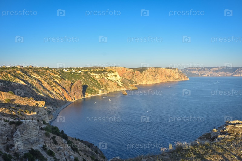Мыс Фиолент. Прекрасные виды на побережье Черного моря на мысе Фиолент летом в ясную погоду. Вид с воздуха на красивое морское побережье с бирюзовой водой и скалами