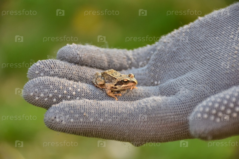 Маленькая лягушка сидит на руке в перчатке