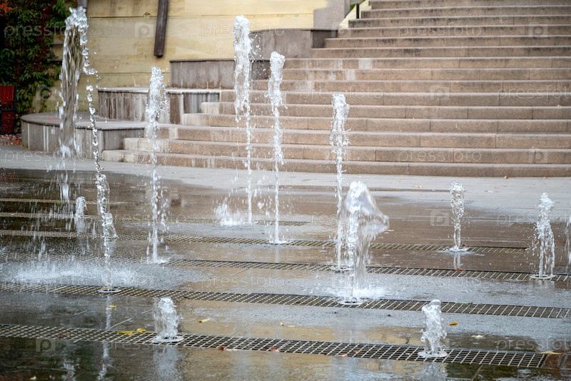 Фонтанирующие брызги плоского фонтана в городском парке крупным планом