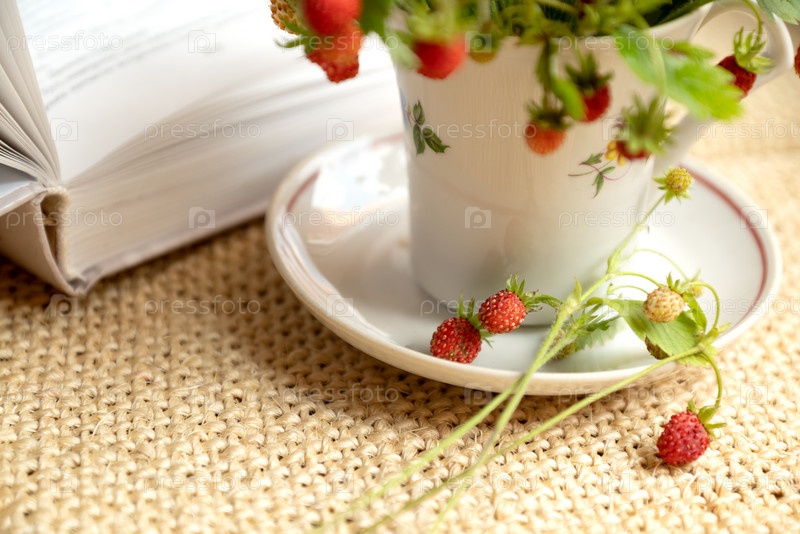 Спелые красные ягоды земляники на ветках, собранные в кучу в чашке чая рядом с летним набором открытой книги