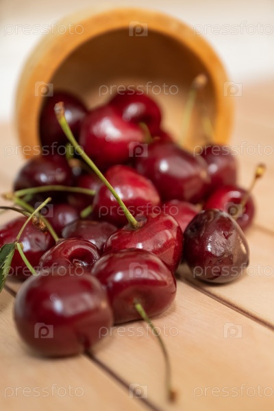 Ягоды черешни разбросаны из миски на поверхности деревянного стола