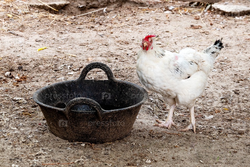 Курица клюет зерно из миски на ферме