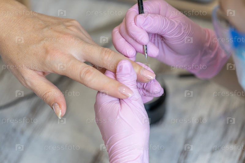 Деталь маникюра ногтей с файлом или кистью. Женщина красивый процесс ухода за ногтями