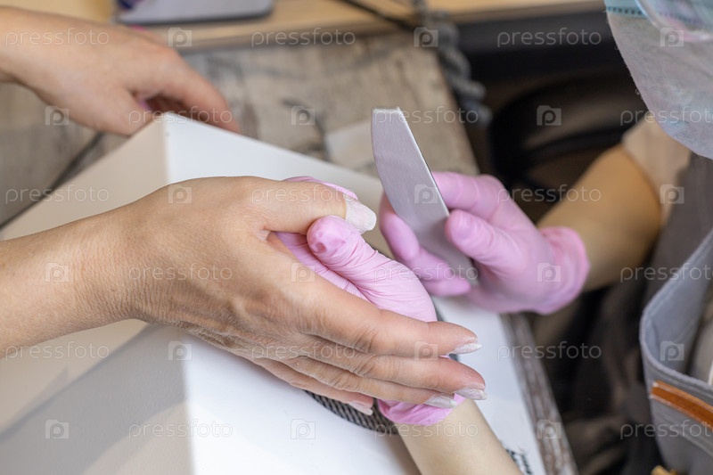 Деталь маникюра ногтей с файлом или кистью. Женщина красивый процесс ухода за ногтями