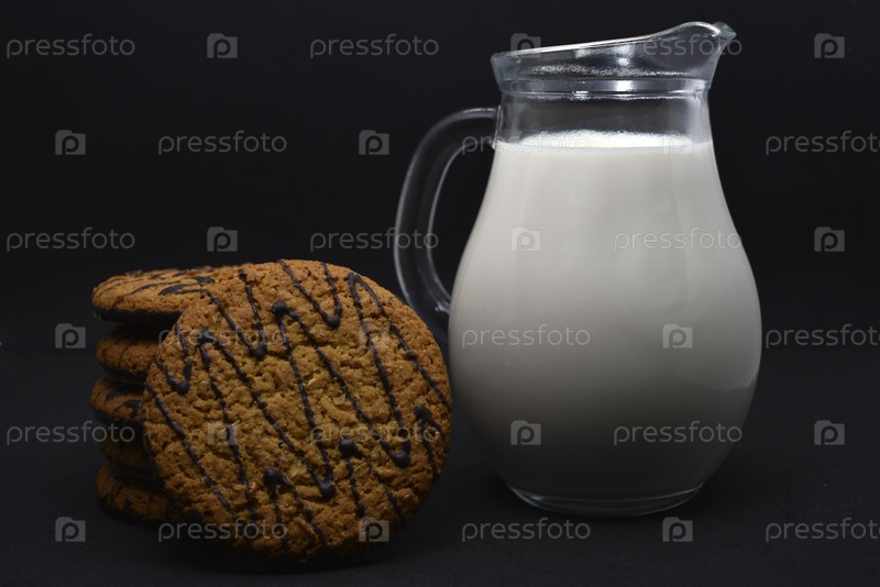 Кувшин молока и овсяное печенье. Вкусный завтрак. Овсяное печенье с молоком