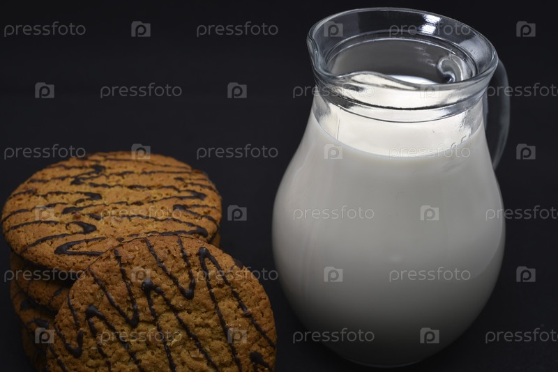 Кувшин молока и овсяное печенье. Вкусный завтрак. Овсяное печенье с молоком