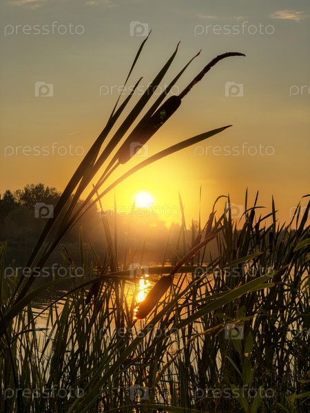 Силуэт растения рогоза на фоне оранжевого закатного неба