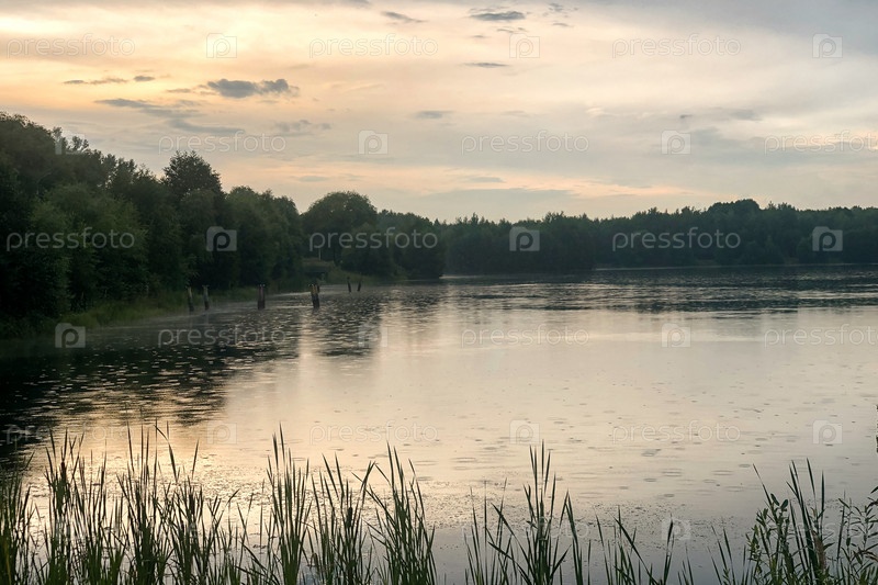 Дождливые круги на спокойной поверхности воды озера в свете заката