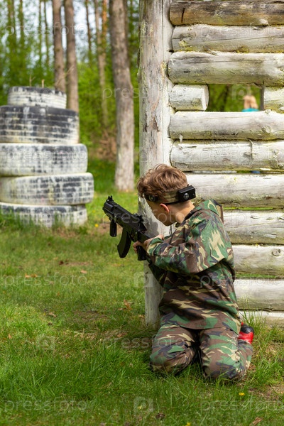 Мальчик в камуфляже играет в лазертаг на специальной лесной площадке. Лазертаг — это командная военно-тактическая игра с использованием безопасного лазерного оружия и датчиков, фиксирующих попадания