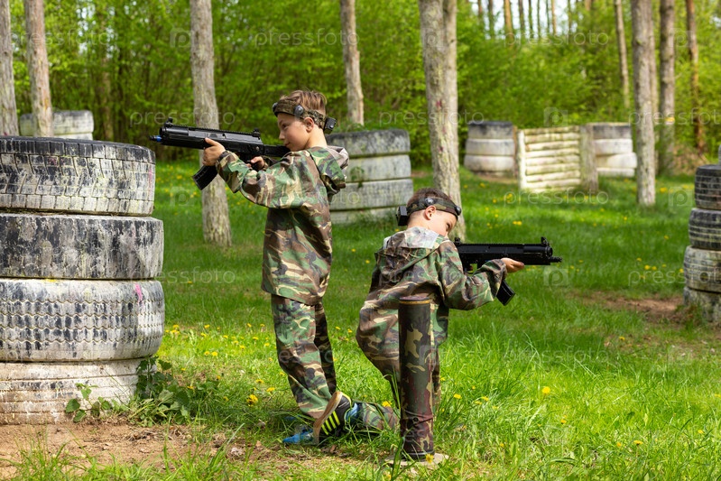 Два мальчика в камуфляже играют в лазертаг на специальной лесной площадке. Лазертаг — это командная военно-тактическая игра с использованием безопасного лазерного оружия и датчиков, фиксирующих попадания