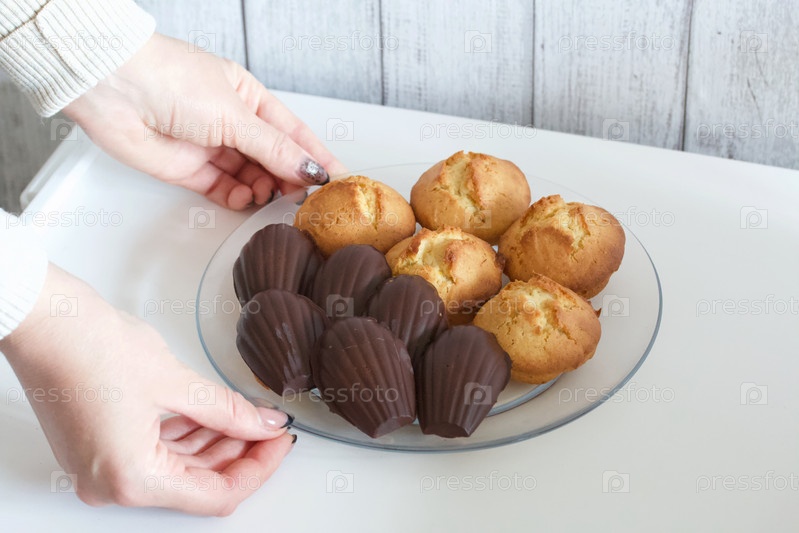 Женщина держит тарелку с домашними кексами и печеньем Мадлен в шоколаде