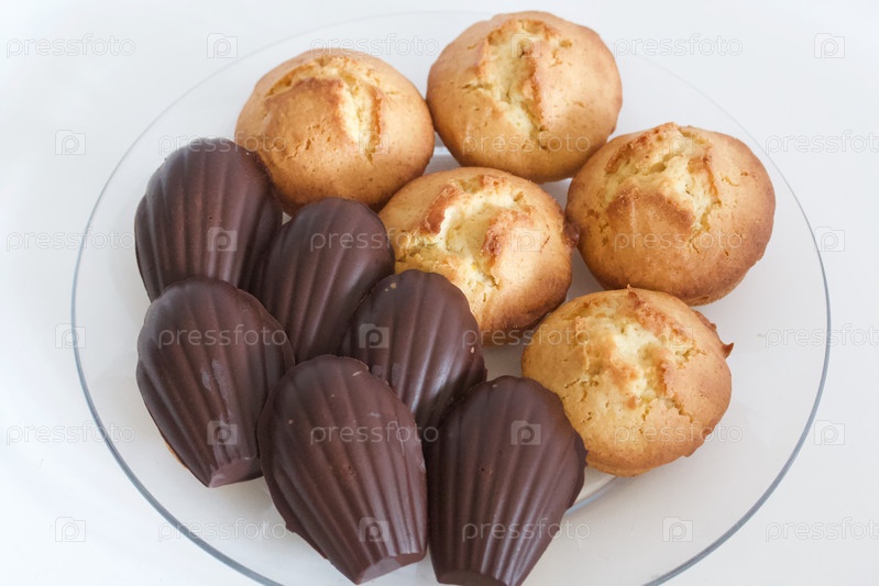 Домашние кексы и печенье Мадлен в шоколаде. Они лежат на тарелке