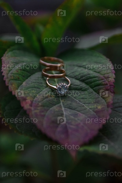 Золотые обручальные кольца на зеленых осенних листьях крупным планом, на размытом фоне вертикальное фото с мягким выбранным фокусом с эффектом пленки и шумом, концепция свадьбы, жених и невеста, семья, свадебные обещания