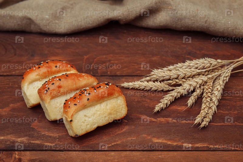 Три маленькие запеченные булочки из пшеничной муки, посыпанные семенами кунжута, лежат на коричневом деревянном фоне с кучей пшеничных колосьев и льняной салфеткой