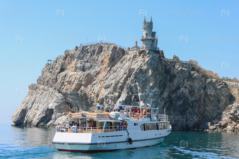 Прогулочный катер, полный людей, стоит на фоне замка Ласточкино гнездо. Готический замок, расположенный на крутом 40-метровом утесе мыса Ай-Тодор. Экскурсионный морской туризм