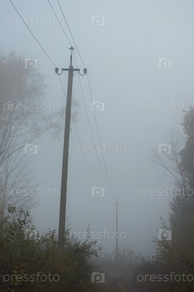 Столбы ЛЭП в туманном лесу. Это мистический, немного жуткий пейзаж