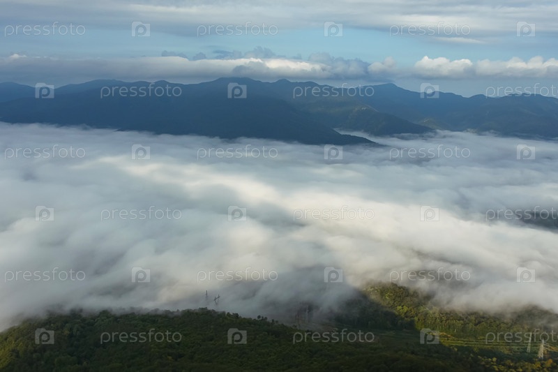 Горная низменность покрыта туманом. На заднем плане горные хребты, небо и дождевые облака. Красивый пейзаж с туманом