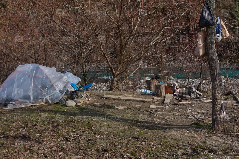 Стоянка бомжей в лесу на берегу горной реки. Палатка покрыта полиэтиленовой пленкой. Мешки с едой висят на дереве. Мусор и пластиковые бутылки вокруг