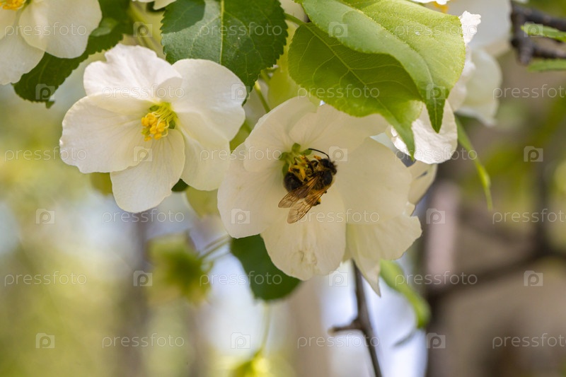 Белые цветущие яблони в лучах солнца. Весенний сезон, весенние краски