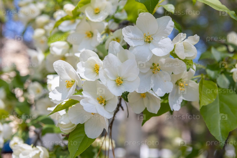 Белые цветущие яблони в лучах солнца. Весенний сезон, весенние краски