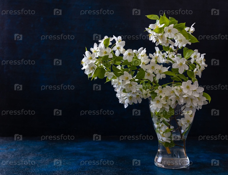 Веточка цветущей яблони в стеклянной вазе на синем фоне