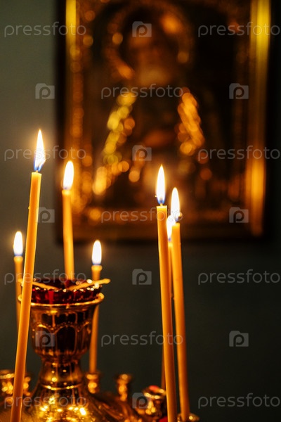 Поминальные свечи горят на алтаре перед иконой