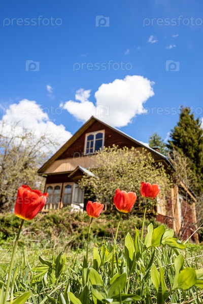 Вид снизу на красные тюльпаны во дворе сельского дома