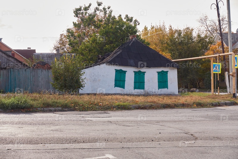 Старый дом с косыми окнами и обрушившейся крышей. Он стоит у дороги на перекрестке и знаке пешеходного перехода. Рядом с газовой трубой