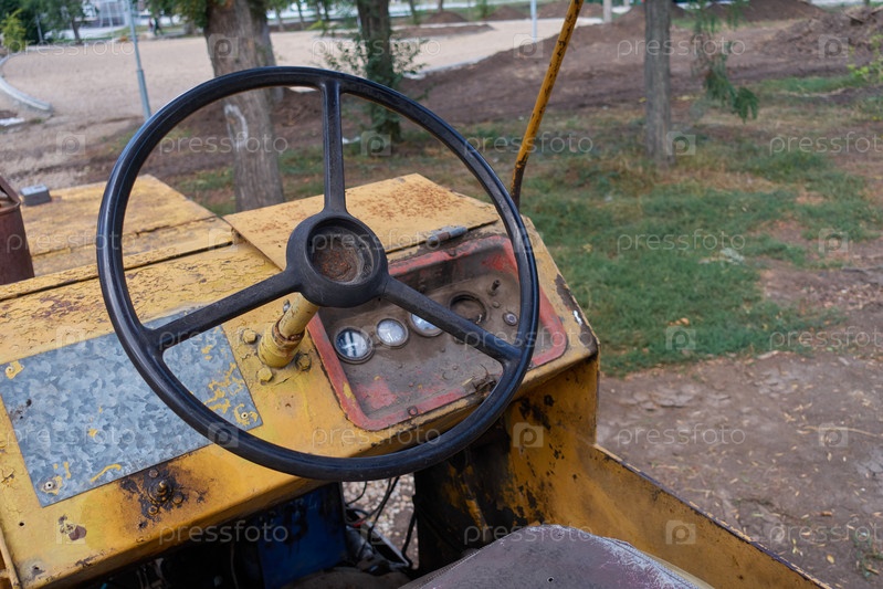 Рулевое колесо на старом ржавом асфальтном катке