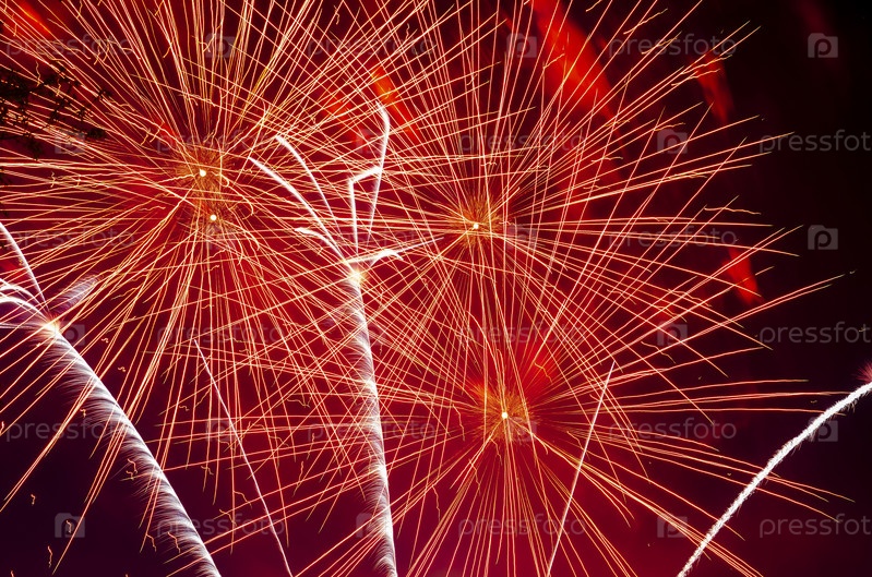 Яркие лучи фейерверков на черном фоне ночного неба. Праздничный фейерверк