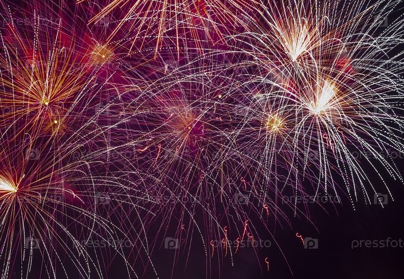 Яркие лучи огня на черном фоне. Праздничный фейерверк на фоне ночного неба в честь Дня Победы