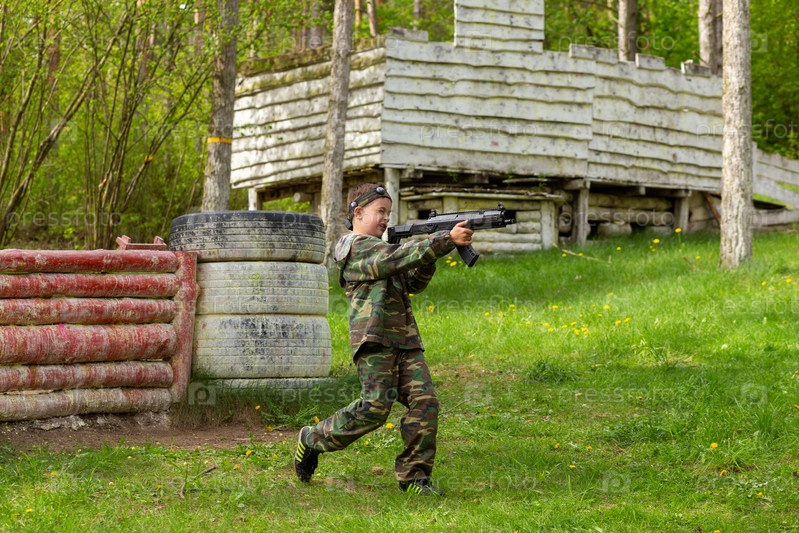 Мальчик в камуфляже играет в лазертаг на специальной лесной площадке