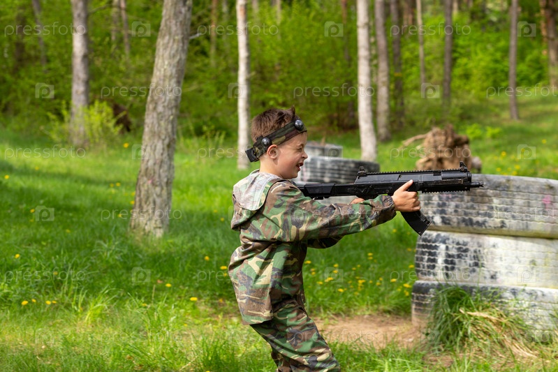 Мальчик в камуфляже играет в лазертаг на специальной лесной площадке