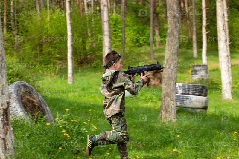 Мальчик в камуфляже играет в лазертаг на специальной лесной площадке
