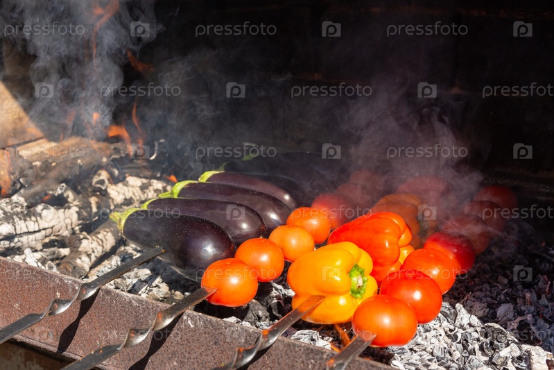 Свежие овощи на гриле для приготовления на металлическом шампуре. Вкусные помидоры, баклажаны, перец, приготовленные на углях. Угольный гриль и огонь, пикники, уличная еда. Мягкий выборочный фокус