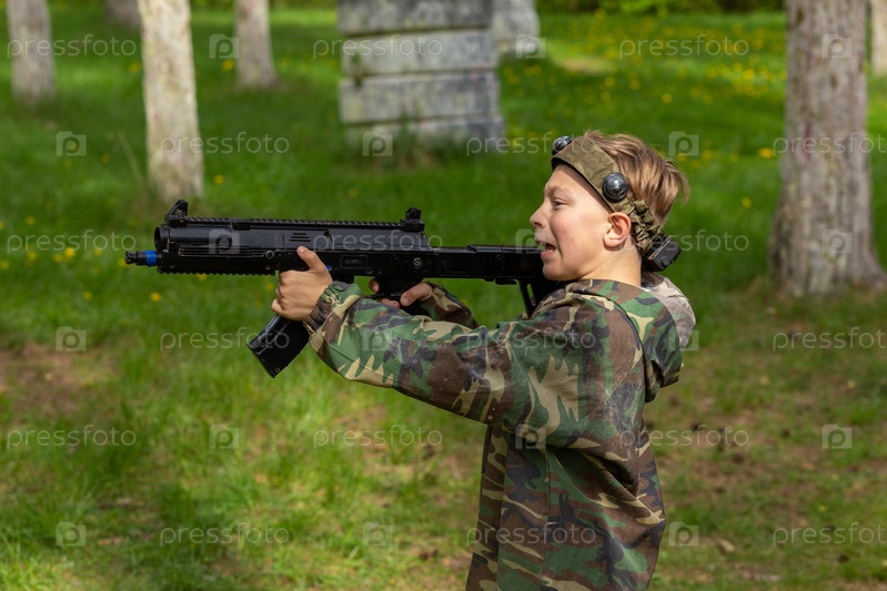 Мальчик в камуфляже играет в лазертаг на специальной лесной площадке