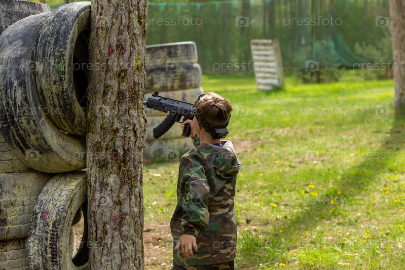 Мальчик в камуфляже играет в лазертаг на специальной лесной площадке