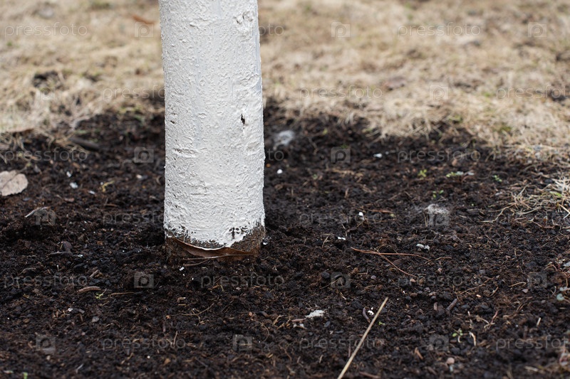 Уход за деревьями, побелка коры деревьев в сезон. Ствол фруктового дерева близко к земле. Работа в саду, концепция садоводства
