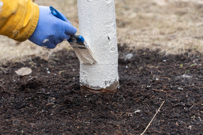 Весенняя работа в саду, концепция садоводства. Нанесение побелки на фруктовые деревья в саду. Человеческая рука в перчатке держит кисть. Садовник красит ствол дерева кистью. Работа в саду. Ствол плодового дерева, защита от вредителей и болезней, меловая п