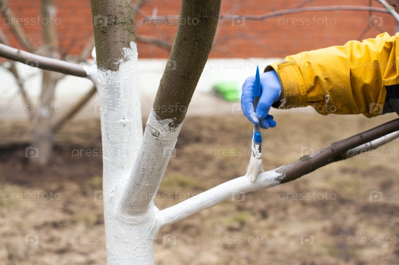 Весенняя работа в саду, концепция садоводства. Нанесение побелки на фруктовые деревья в саду. Человеческая рука в перчатке держит кисть. Садовник красит ствол дерева кистью. Работа в саду. Ствол плодового дерева, защита от вредителей и болезней, меловая п