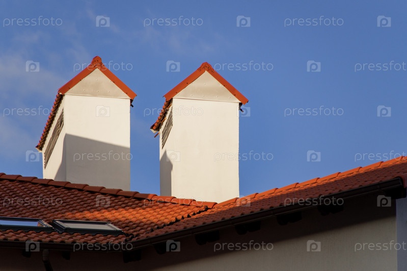 Черепичная крыша жилого дома с белыми вентиляционными трубами и ливневой канализацией, крупным планом детали архитектурного сооружения в солнечный день. Текстура гипса больших труб на фоне голубого неба