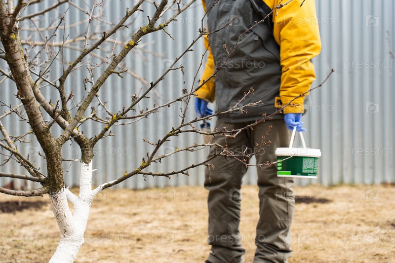 Весенняя работа в саду, концепция садоводства. Нанесение побелки на фруктовые деревья в саду. Человеческие руки в перчатках держат кисть и ведро с побелкой. Садовник красит ствол дерева кистью. Работа в саду. Ствол плодового дерева, защита от вредителей и