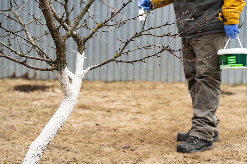 Весенняя работа в саду, концепция садоводства. Нанесение побелки на фруктовые деревья в саду. Человеческие руки в перчатках держат кисть и ведро с побелкой. Садовник красит ствол дерева кистью. Работа в саду. Ствол плодового дерева, защита от вредителей и