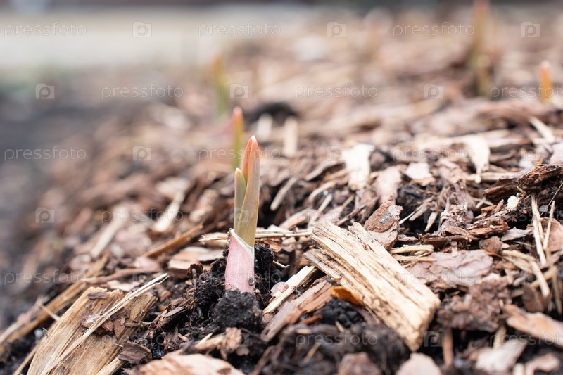 Закройте молодой росток чеснока в саду. Маленькое растение на куче почвы в саду