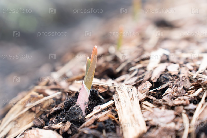 Закройте молодой росток чеснока в саду. Маленькое растение на куче почвы в саду
